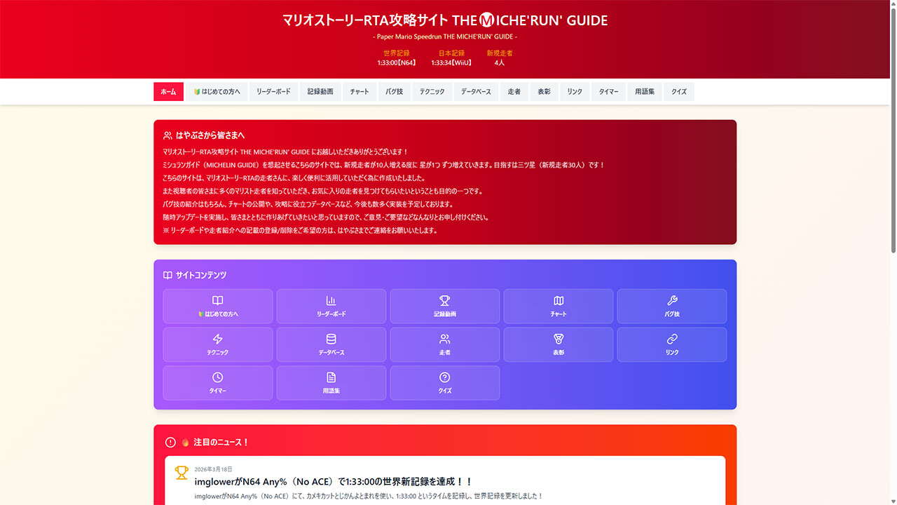 ついに、日本のRTAコミュニティにおいて記念碑的なプロジェクトが始動しました。なぜなら、国内屈指の走者であるはやぶさ氏の手によって、待望の『マリオストーリー』RTA日本語攻略サイトが公開されたからです。このサイトの名称は“THE MICHE’RUN’ GUIDE”と名付けられており、すでに多くの走者から注目を集めています。